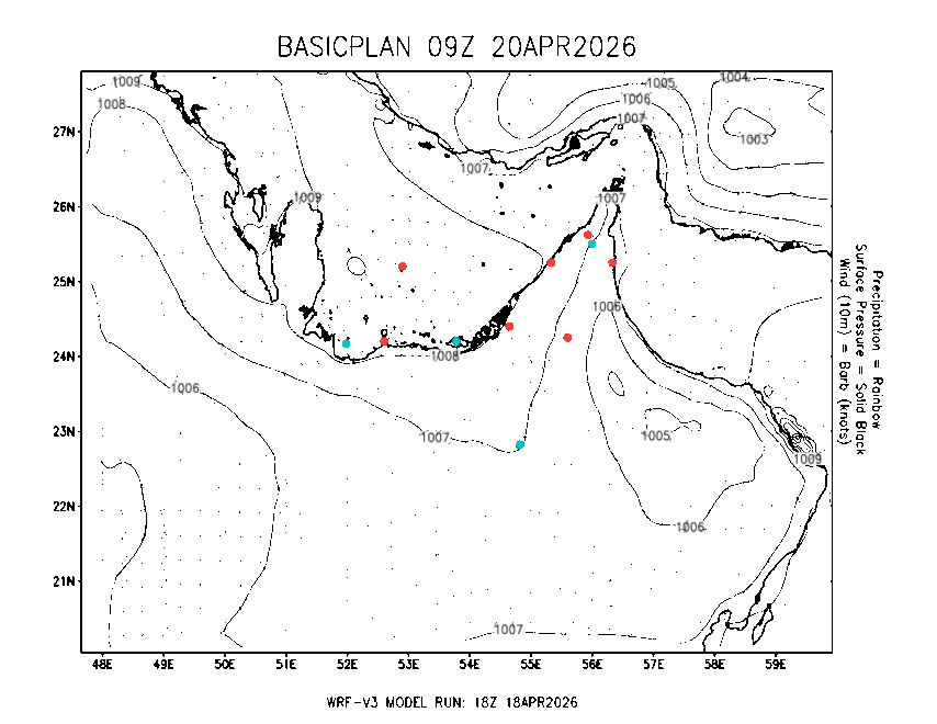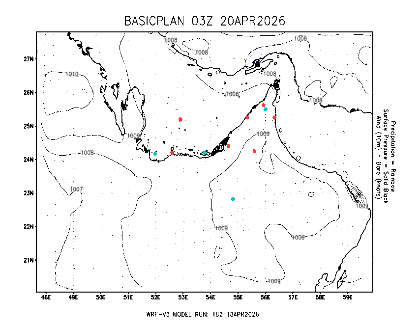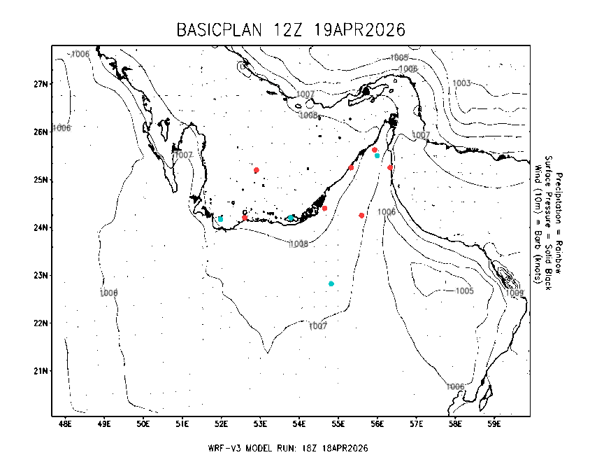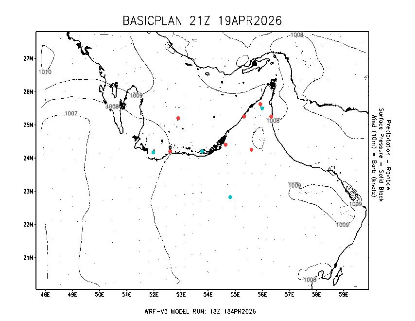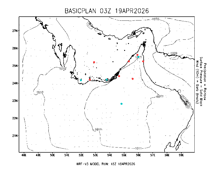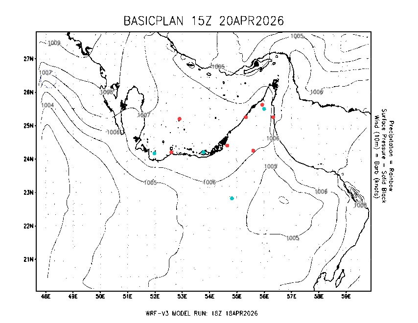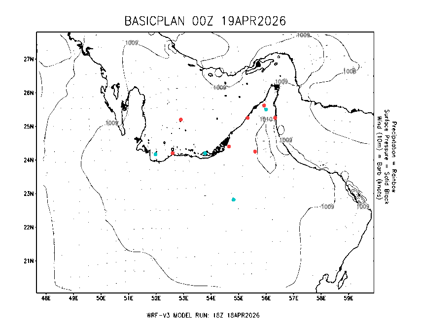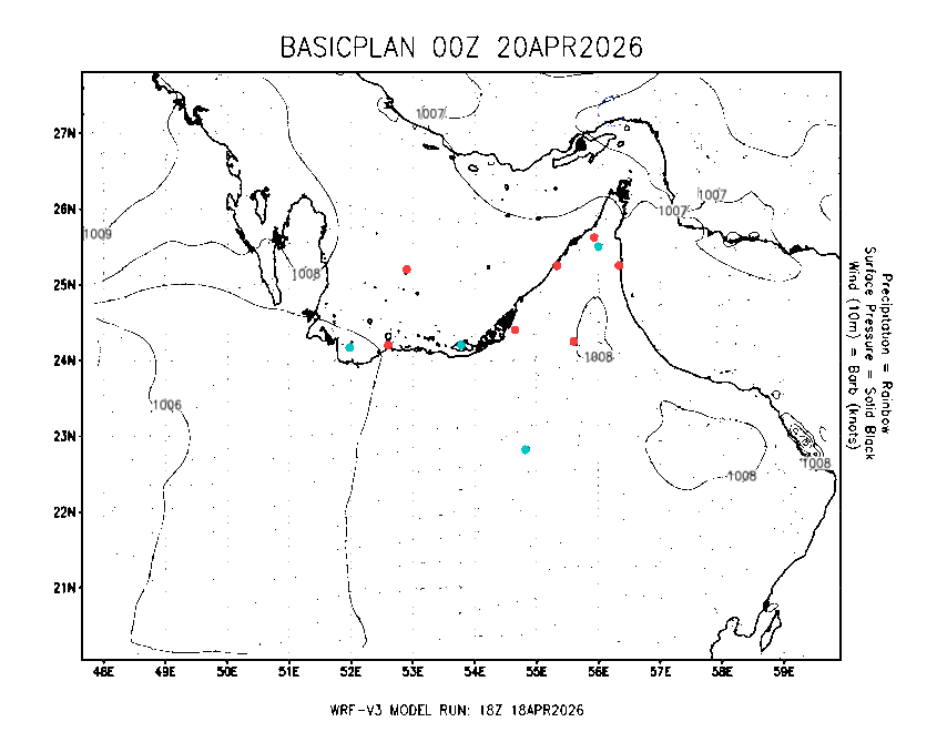 The Meteorlogical Office at Zayed International Airport has its own in-house Weather Research and Forecasting (WRF) workstation providing numerical model data output files for the Gulf region. The files include amongst others: 48-hour plan views of surface temperature, winds and pressure; custom created plots for thunderstorms and fog as well as 48-hour time-sections for select stations, to a depth of 100hpa, showing instability, wind, temperature, humidity values and the freezing level.