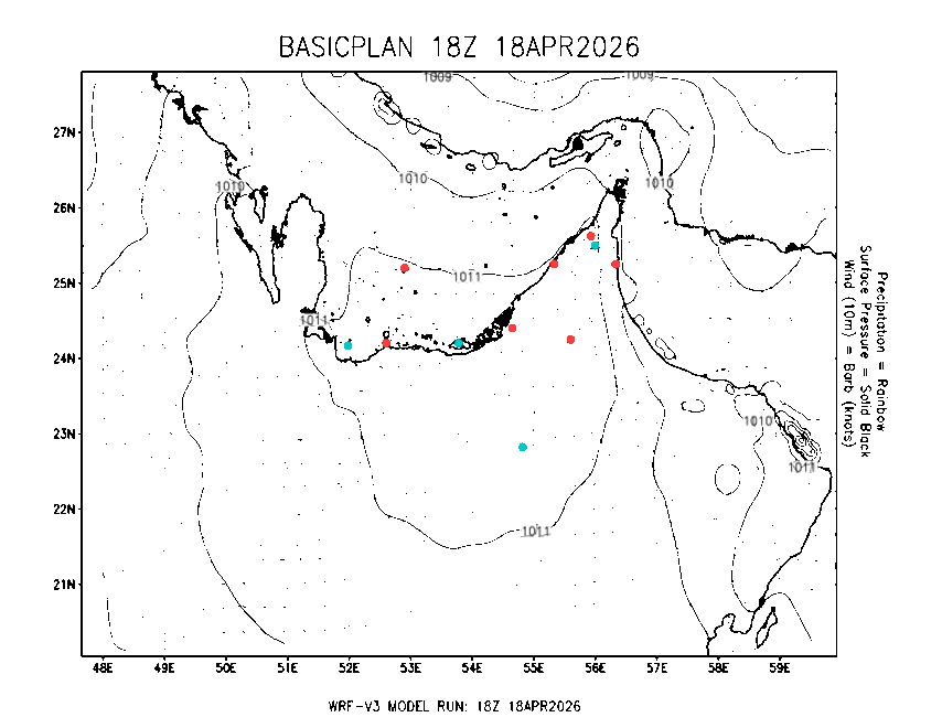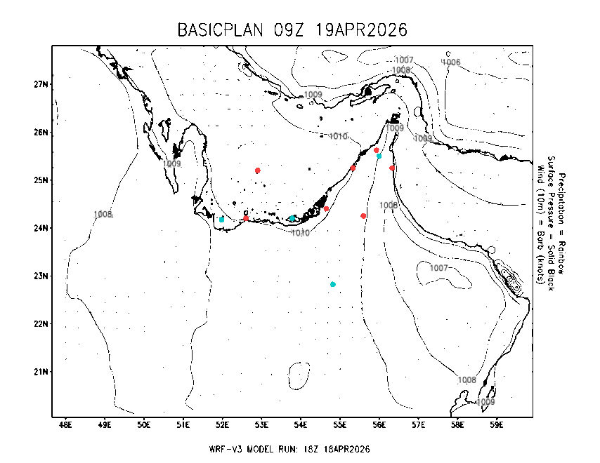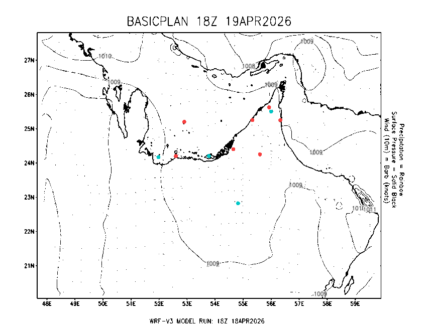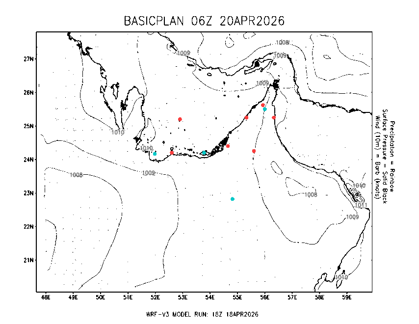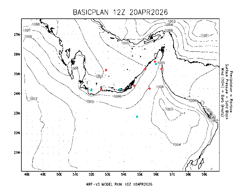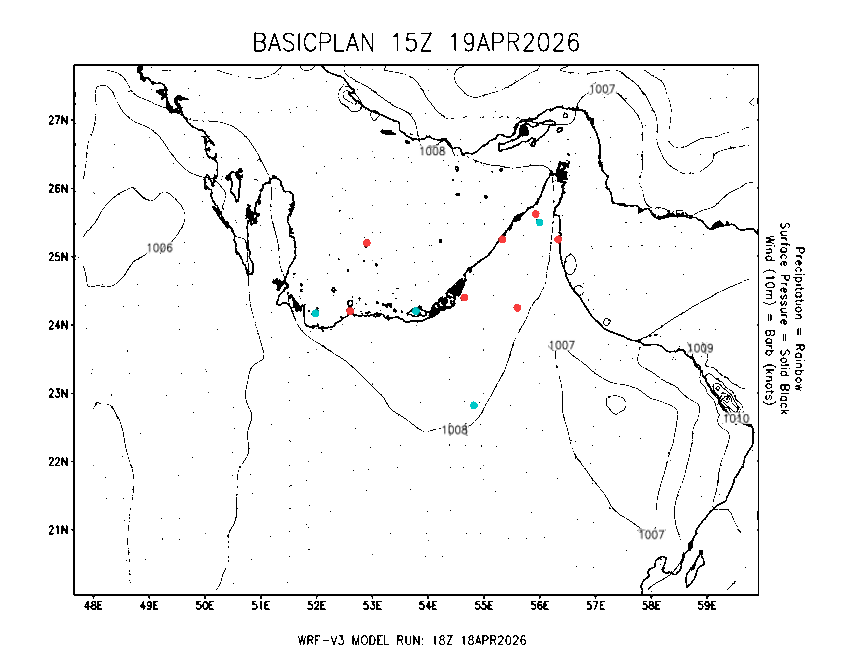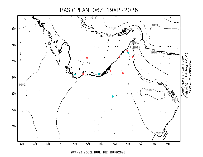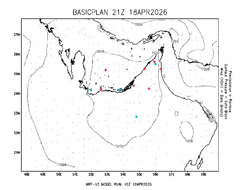 The Meteorlogical Office at Zayed International Airport has its own in-house Weather Research and Forecasting (WRF) workstation providing numerical model data output files for the Gulf region. The files include amongst others: 48-hour plan views of surface temperature, winds and pressure; custom created plots for thunderstorms and fog as well as 48-hour time-sections for select stations, to a depth of 100hpa, showing instability, wind, temperature, humidity values and the freezing level.